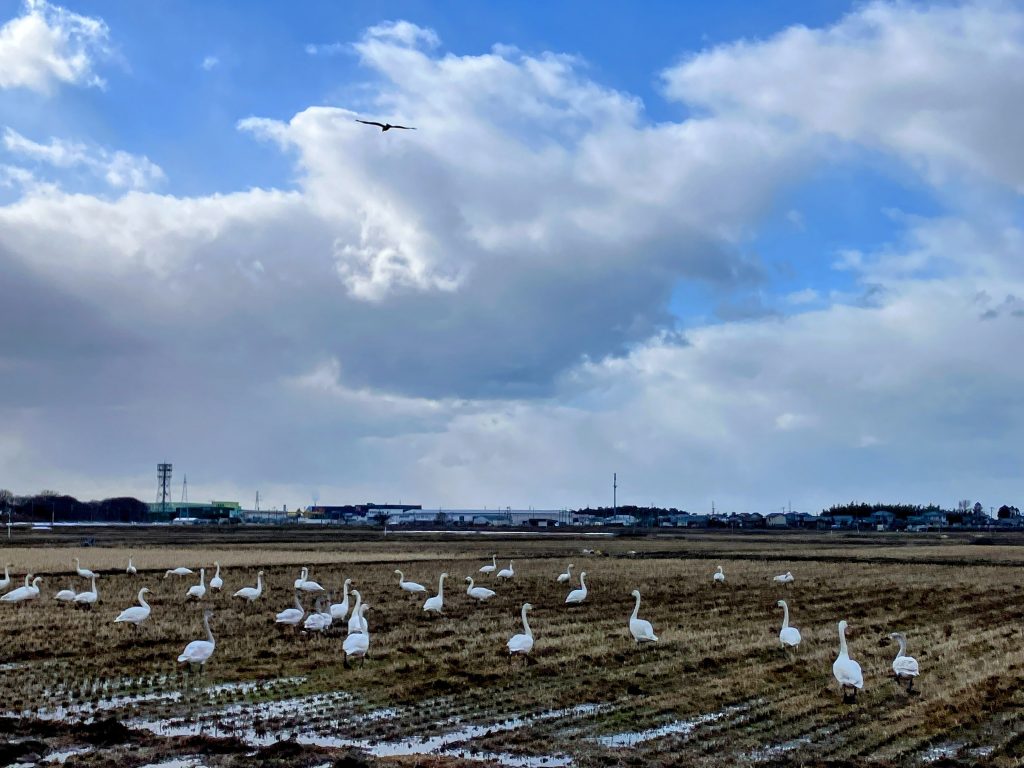 墓参りの帰り道。白鳥が餌を探し、その上空で